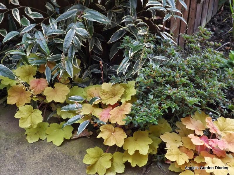 and on the other side of the path, 3 more fully recovered Heuchera Caramel, albeit less floriferous. This part of the garden is never used, it's mainly the thoroughfare between me and next door. I legally have to allow them access to my side path but they never use it, except to pop over for a blether.