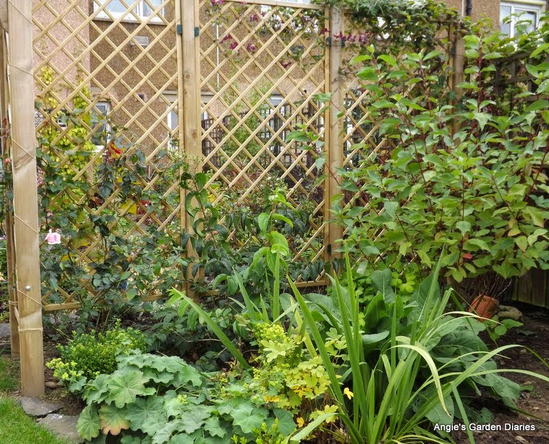 Over the other side of the trellis - plenty of foliage paired with a few Clematis flowers. The late summer flowering shrub Heptacodium miconoides is just coming into bloom. You know it's been a good summer here when it flowers. In general, this usually flowers later and the buds have been known to get caught by an early frost. The Alchemilla is also throwing up a few late blooms too.