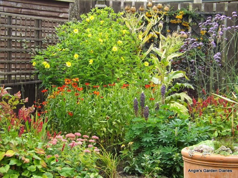 The top end, the sunniest spot in the garden and the topic of my EOMV is still looking in reasonable, I think. The perennial sunflower, Helianthus Lemon Queen, has exceeded my expectation. New flowers are opening every day. For the moment, I am leaving the tall stems of the Cardoon alone. I am interested to see if the birds are attracted to those seed heads. The yellow/orange berries of the Pyracantha adds a bit of colour to the back fence. Sedum, Persicaria, Crocosmia, Verbena and Helenium still have their wares on offer for the pollinators.