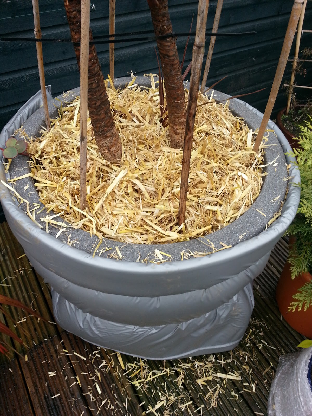 The excersise mat was secured around the pot with bundgy ropes - these too were doing 'nothing' in the shed. I filled right up to the brim of the container with straw. Fingers crossed that these should keep the frost at bay!!