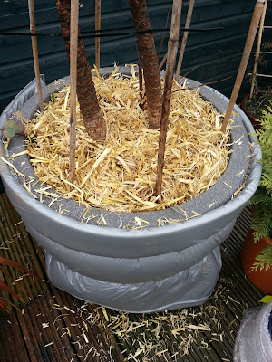 I know I have said previously that I intend to plant only hardy plants in my garden - there have been 1 or 2 which have slipped under radar. I am also the proud carer of a reasonable sized Cordyline australis. I say carer as it was not my choice to buy it but it's care has been left in my hands.