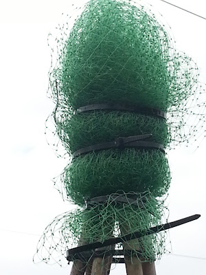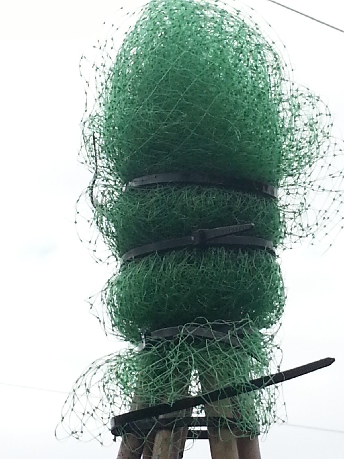 Before pulling the fleece over I thought it would be a good idea to soften the tops of the canes - experience has told me that garden fleece will tear on the edges of the canes. I used some garden netting tied into a ball of sorts and attached with, yes you guess it, cable ties!!