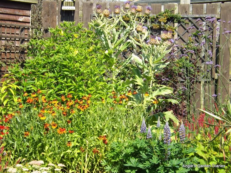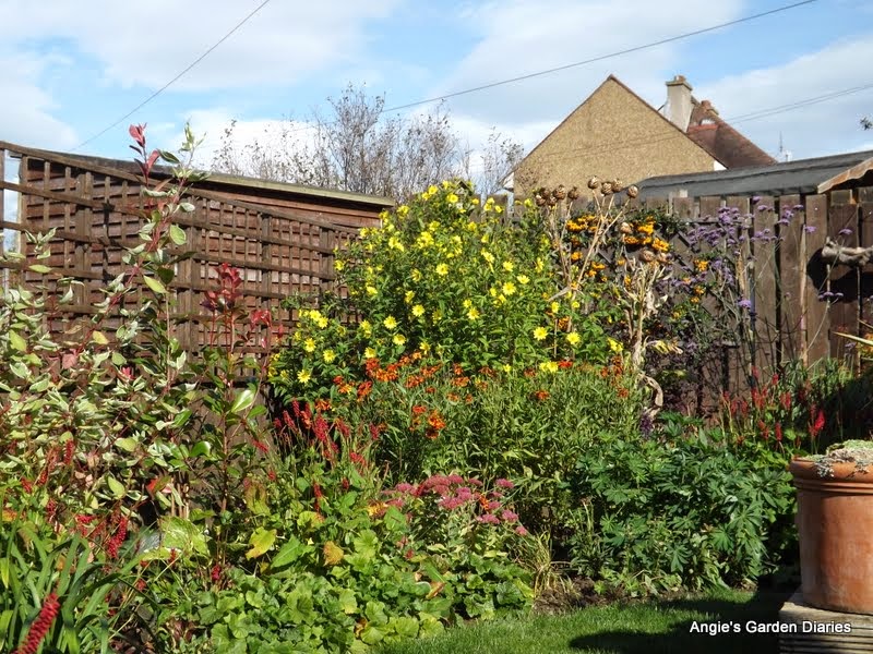 Helianthus Lemon Queen, must have put on another foot of growth over the past 4 weeks - I just love the size of these beauties and they are doing a far better job of hiding fencing than the shrubs are right now. The cardoons are long past their best, I read somewhere that the birds should enjoy the seeds from this plant, I'm not sure how long those bone dry stems will last in this wind, so they'd best get a move on! It's hard to miss the acid yellow berries on the Pyracantha (P. Golden Charmer) covering the back fence. Both the Helianthus and Pyracantha really stand out when the sun has gone over the roof tops.