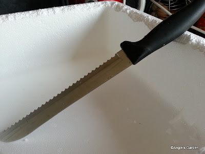 The bread knife I used to roughen up the polystyrene. A pad saw would have, I'm sure, been better but as I did not manage to find it in the shed until after I had finished this stage I made do with the bread knife!! Typical!! You could also use a hacksaw blade - with a handle created by wrapping tape around the one of the ends.