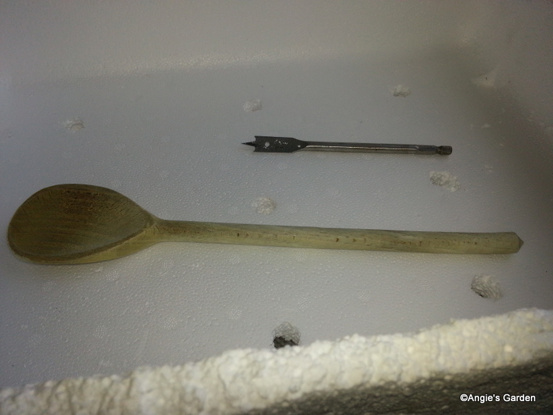 The next stage was to create drainage holes (important for plants) - I used a 16mm spade drill bit on a very slow speed. Using gentle pressure (very little was needed) and taking care not to crack or damage the base at this point, I drilled through the base onto an old board I had placed underneath. The holes were then smoothed off with the end of a wooden spoon!